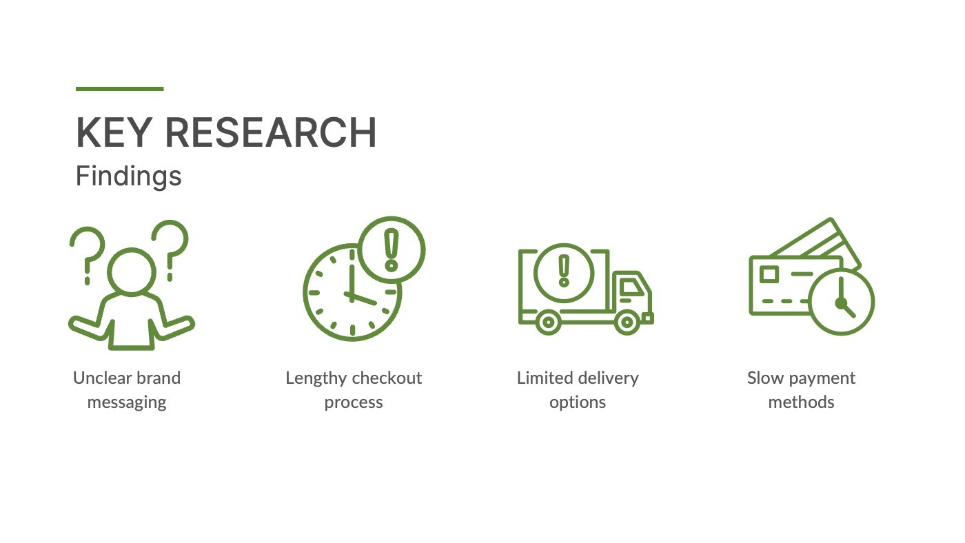 Through market research, competitor analysis, user interviews, and usability testing, we uncovered key barriers: unclear brand messaging, a lengthy checkout process, limited delivery options, and slow payment methods.